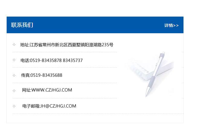 地址:常州市新北區友邦商務大廈1幢16、17層  電話:0519-85101652  傳真:0519-85112595  郵編:213022  網址:www_cz-jiayue_cn.ccsyckj.com  郵箱:xiajifengaa@163.com
